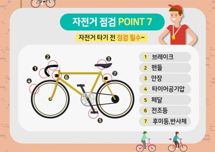 자전거를 타기 전에는 반드시 자전거 상태를 점검해야 합니다. 다음은 체크해야 할 주요 사항들입니다: