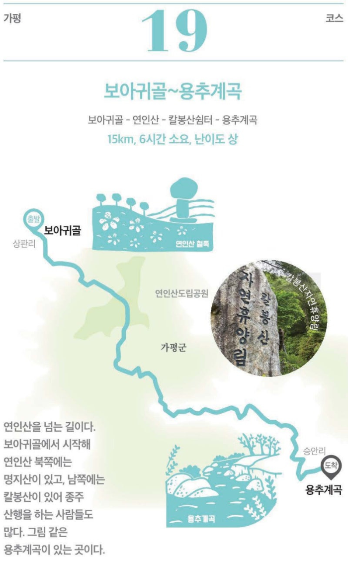 하이킹 코스는 보통 6시간 정도 소요되며, 다양한 연령층이 즐길 수 있도록 설계되어 있습니다. 코스는 보아귀골에서 시작하여 용추계곡까지 이어지며, 중간에 여러 휴식 공간이 마련되어 있어 편안하게 하이킹을 즐길 수 있습니다.
