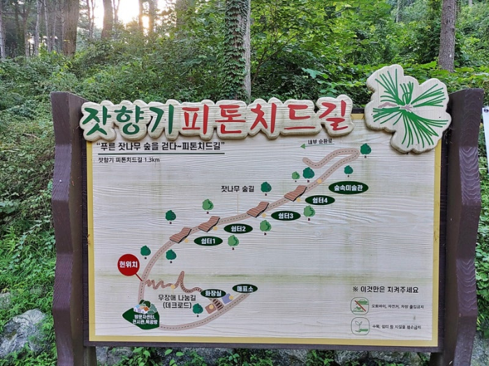 가평 잣향기피톤치드길은 경사가 완만하여 누구나 쉽게 걸을 수 있는 코스입니다. 트레일은 1.3km 구간으로 나뉘어져 있으며, 각 구간마다 다양한 볼거리가 있습니다. 특히, 트레일의 시작점에는 안내판이 있어 코스에 대한 정보를 쉽게 확인할 수 있습니다.