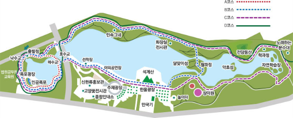 - 코스 A : 시계탑 → 장미원 → 달맞이섬 → 화장실문화전시관 → 민속그네 → 애수교 → 선착장