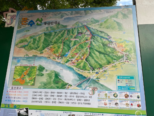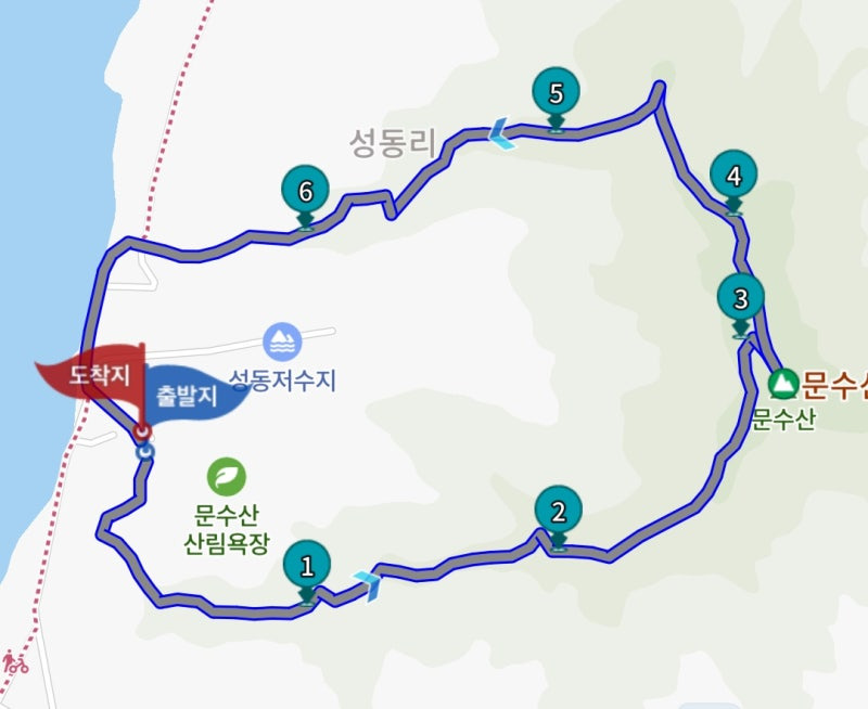 - 이 코스는 성동리에서 시작하여 문수산 정상으로 올라가는 코스입니다. 약간의 경사가 있지만, 경치가 뛰어나 초보자도 도전할 수 있습니다.