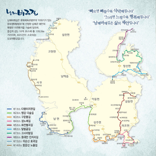 남해 바래길은 남해의 천혜의 자연환경을 배경으로 한 걷기 여행길입니다. 총 16개의 본선 코스와 4개의 지선 코스, 그리고 관광 테마 지선 1개 코스가 마련되어 있어 다양한 경로를 선택할 수 있습니다. 이 길은 바다와 산, 그리고 마을을 연결하며, 걷는 이들에게 잊지 못할 경험을 선사합니다.