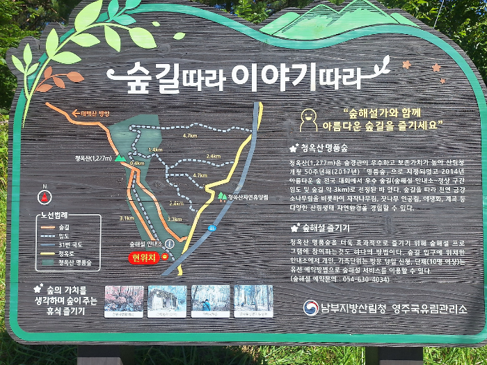 청옥산의 숲길은 총 8km에 달하며, 다양한 난이도로 구성되어 있습니다. 주차장에서 시작하여 여러 코스를 선택할 수 있으며, 청옥산 정상까지는 비교적 완만한 길이 이어집니다. 특히 1.2km 지점에 위치한 명상쉼터는 휴식하기 좋은 장소로 추천합니다.
