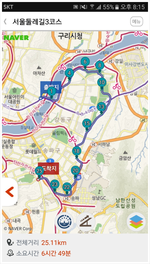 이 코스는 총 25.6km의 거리로, 평균적으로 6시간에서 8시간 정도 소요돼요. 걷는 속도에 따라 다르겠지만, 여유롭게 경치를 감상하며 걷는다면 8시간 정도는 잡아야 할 것 같아요. 코스의 시작점은 광나루역이며, 중간에 명일근린공원과 같은 휴식 공간도 있어요.