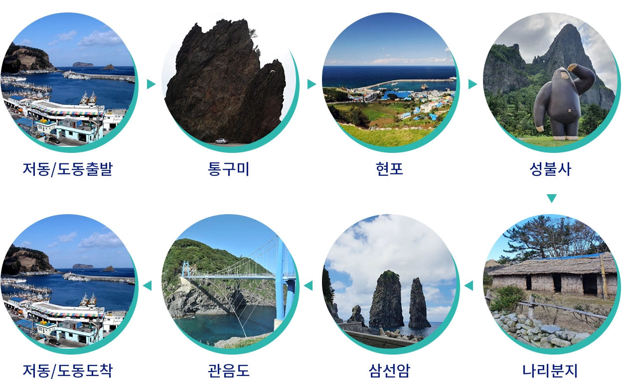 저동에서 통구미까지의 구간에는 여러 명소가 있습니다. 특히, 통구미의 거북바위는 꼭 방문해야 할 장소입니다. 이곳은 독특한 바위 형상으로 유명하며, 많은 사진작가들이 이곳을 찾습니다. 또한, 해안선을 따라 펼쳐진 절벽과 푸른 바다는 여행의 즐거움을 더해줍니다. 이 외에도 삼선암, 관음도 등 다양한 자연 경관을 감상할 수 있습니다.