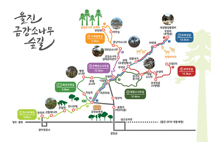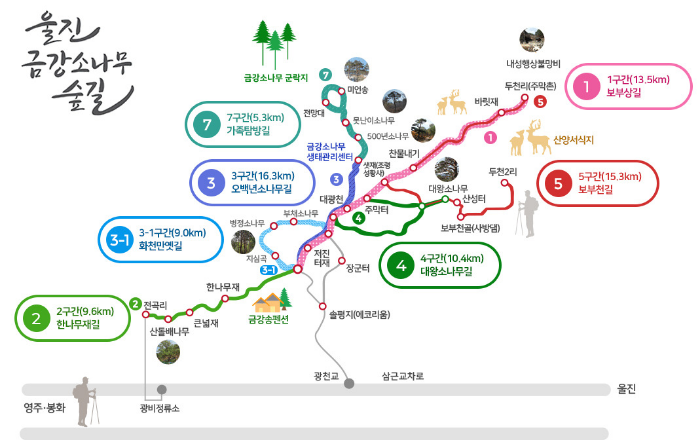 울진 금강 소나무숲길은 총 7개 구간으로 나뉘어 있으며, 총 길이는 약 79.4km에 달합니다. 각 구간은 서로 다른 매력을 가지고 있어 다양한 경로를 통해 탐방을 즐길 수 있습니다. 특히 1구간인 보부상길과 3구간인 오백년소나무길은 많은 사람들이 찾는 인기 코스입니다. 이곳은 아름다운 경치를 감상하며 건강을 챙길 수 있는 완벽한 장소입니다.
