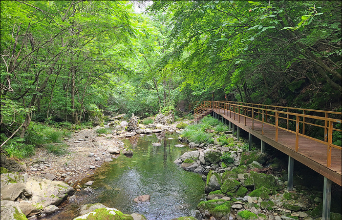 항골숨바우길은 총 길이 약 7.7km로, 백석봉과 상원산 사이에 위치한 계곡입니다. 이곳은 원시림이 가득한 숲길과 이끼를 머금은 바위, 그리고 맑은 계곡이 어우러져 있어 걷기 좋은 명품 숲길로 선정되었습니다. 특히, 이곳은 다양한 식물과 동물들이 서식하고 있어 자연을 사랑하는 이들에게는 더할 나위 없는 장소입니다.