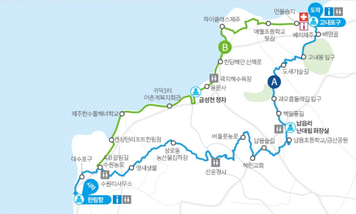 - A코스 : 한림항에서 시작하여 고내포구까지 이어지는 경로로, 약 4~5시간 정도 소요됩니다. 이 코스는 주로 평탄한 길로 이루어져 있어 걷기 편리합니다.
