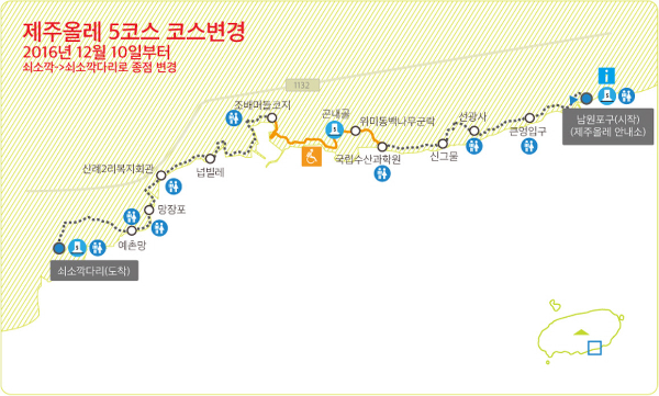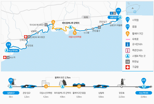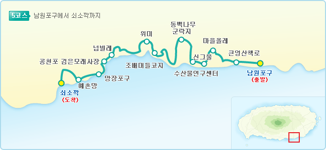 5코스는 남원포구에서 시작하여 쇠소깍까지 이어집니다. 남원포구는 제주도 서귀포시에 위치해 있으며, 이곳에서 출발하여 위미리 복지회관을 지나 쇠소깍 다리까지 도착하게 됩니다. 전체 코스는 약 13.4km로, 대체로 평탄한 길이지만 일부 구간에서는 험한 바위길도 포함되어 있어 주의가 필요합니다.