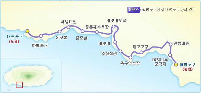제주올레길 8코스는 월평 아왜낭목 쉼터에서 시작하여 대평포구까지 이어지는 약 15.6km의 코스입니다. 이 코스는 해안선을 따라 걷는 길로, 아름다운 바다와 함께 다양한 자연경관을 감상할 수 있습니다. 특히, 주상절리와 같은 독특한 지형이 많아 많은 이들이 찾는 명소입니다.