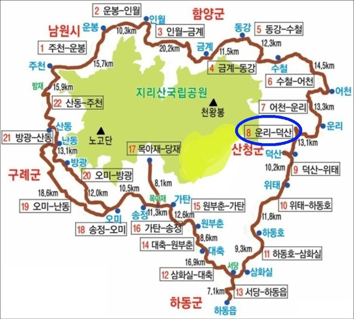 대축에서 원부춘까지 이어지는 8코스는 약 13km에 달하며, 경남 산청군 단성면 운리에서 시천면 덕산까지 이어집니다. 이 구간은 농로와 임도, 산길을 따라 걸어야 하며, 난이도는 중급에 해당합니다. 특히 이 구간은 잘 관리된 트레킹 코스이기 때문에 초보자부터 숙련자까지 모두 즐길 수 있습니다.