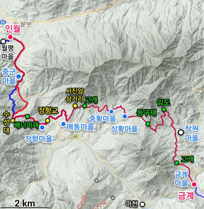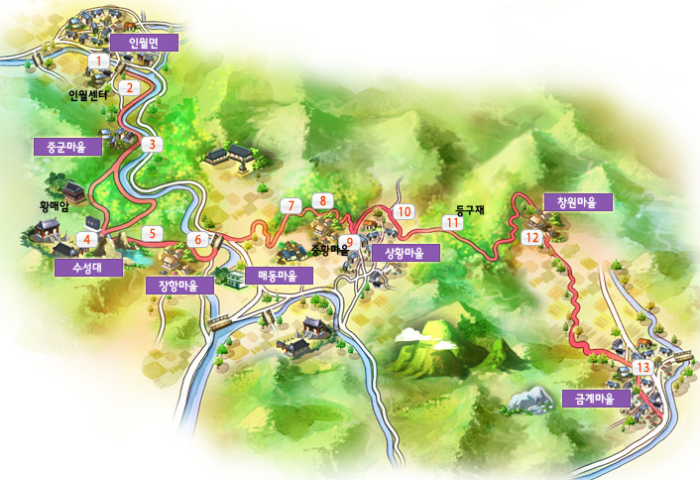 인월에서 시작하여 금계로 가는 길은 주로 숲길과 농로로 구성되어 있습니다. 첫 출발점인 인월리에서 구인월교를 건너고, 제방길을 따라 이동하게 됩니다. 이후 농로와 차도를 지나면서 다양한 경치를 만날 수 있습니다.