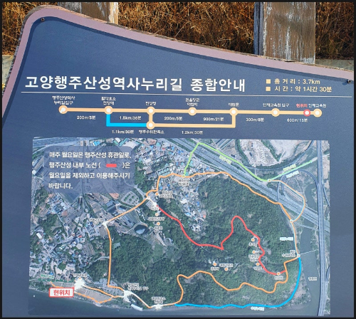 행주산성길은 고양시의 대표적인 트레킹 코스 중 하나로, 총 길이는 약 3.7km에 달하며, 소요 시간은 약 1시간 30분 정도입니다. 이 길은 고양 누리길 5코스에 해당하며, 자연과 역사적인 유적지를 동시에 경험할 수 있는 특별한 코스입니다.